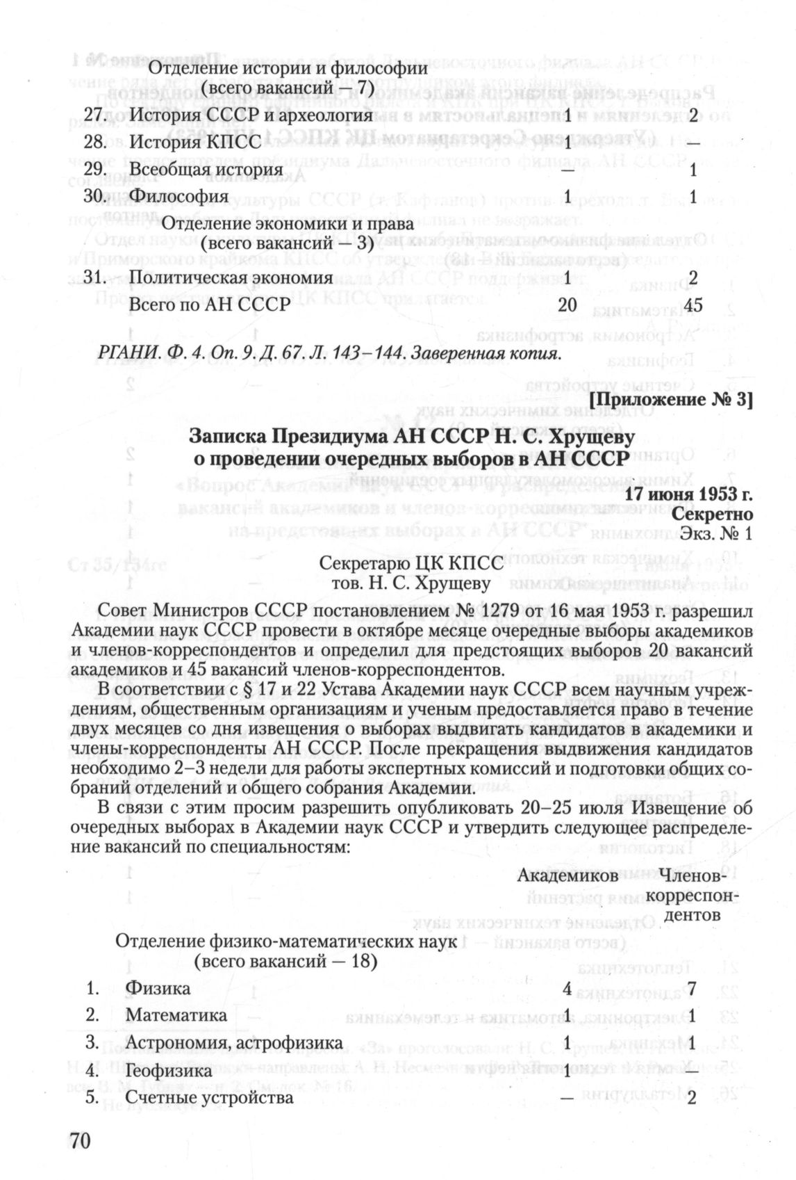 Записка Президиума АН СССР Н. С. Хрущеву о проведении очередных выборов в АН СССР. 17 июня 1953 г. // РГАНИ. Ф. 4. Oп. 9.Д. 844. Л. 177-179. Подлинник.
