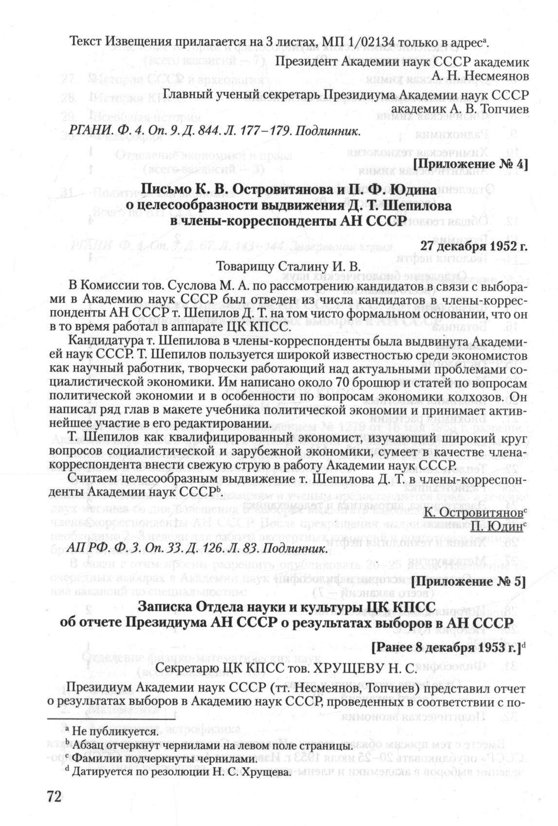 Письмо К. В. Островитянова и П. Ф. Юдина о целесообразности выдвижения Д. Т. Шепилова в члены-корреспонденты АН СССР. 27 декабря 1952 г.
