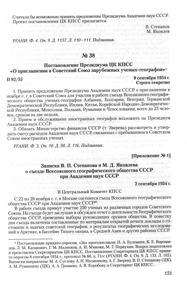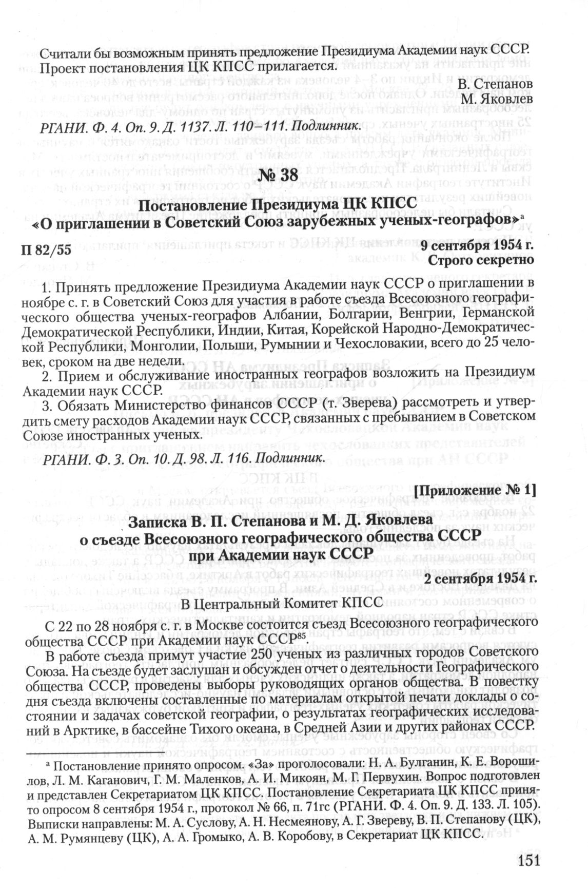 Записка В. П. Степанова и М. Д. Яковлева о съезде Всесоюзного географического общества СССР при Академии наук СССР. 2 сентября 1954 г.