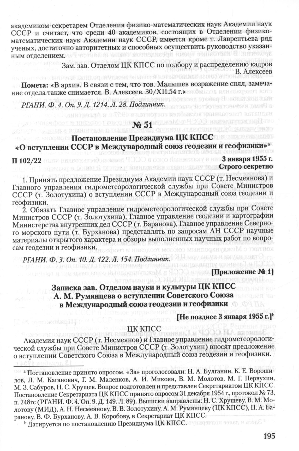 Постановление Президиума ЦК КПСС «О вступлении СССР в Международный союз геодезии и геофизики». 3 января 1955 г.