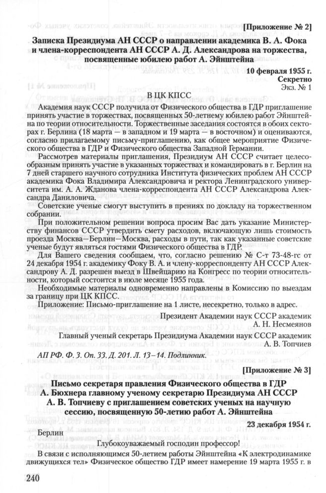 Записка Президиума АН СССР о направлении академика В. А. Фока и члена-корреспондента АН СССР А. Д. Александрова на торжества, посвященные юбилею работ А. Эйнштейна. 10 февраля 1955 г. // АП РФ. Ф. 3. Oп. 33. Д. 201. Л. 13-14. Подлинник.