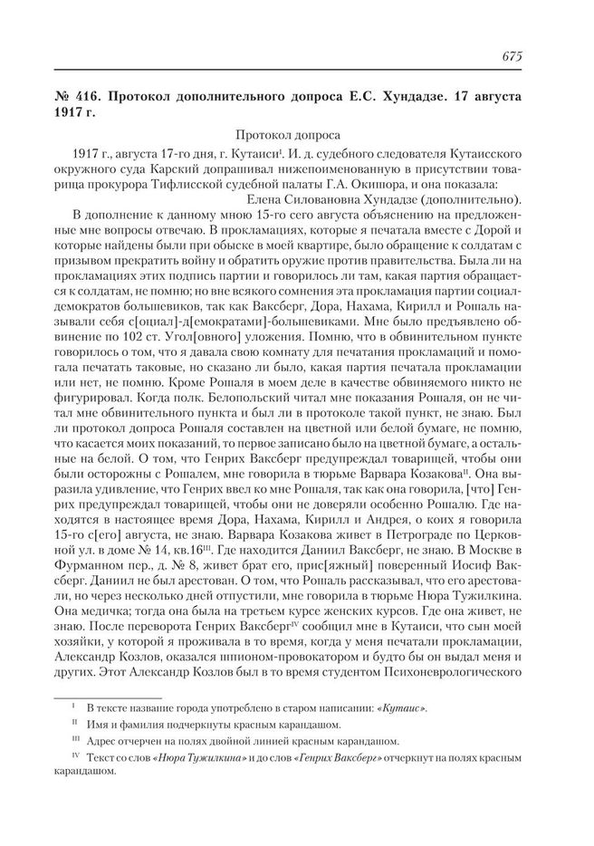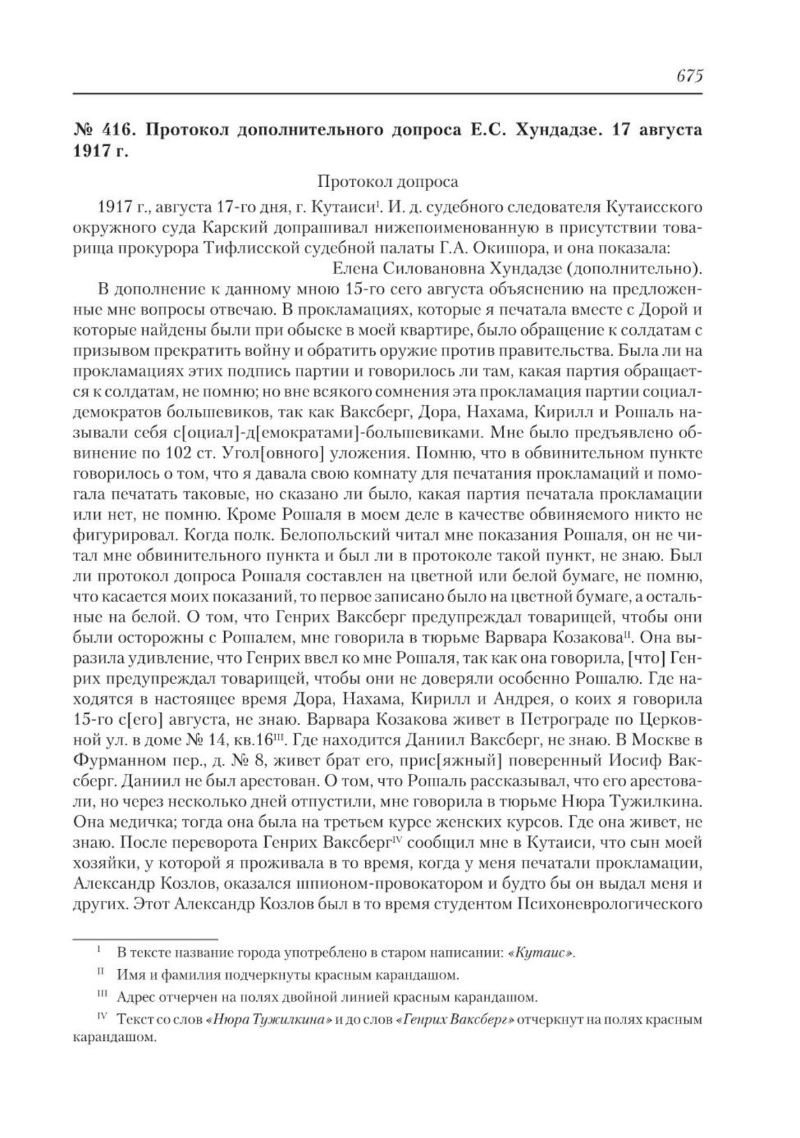Протокол дополнительного допроса Е.С. Хундадзе. 17 августа 1917 г. : Протокол допроса // ГА РФ. Ф. 1826. Оп. 1. Д. 9. Л. 47–48. Подлинник. Рукопись.