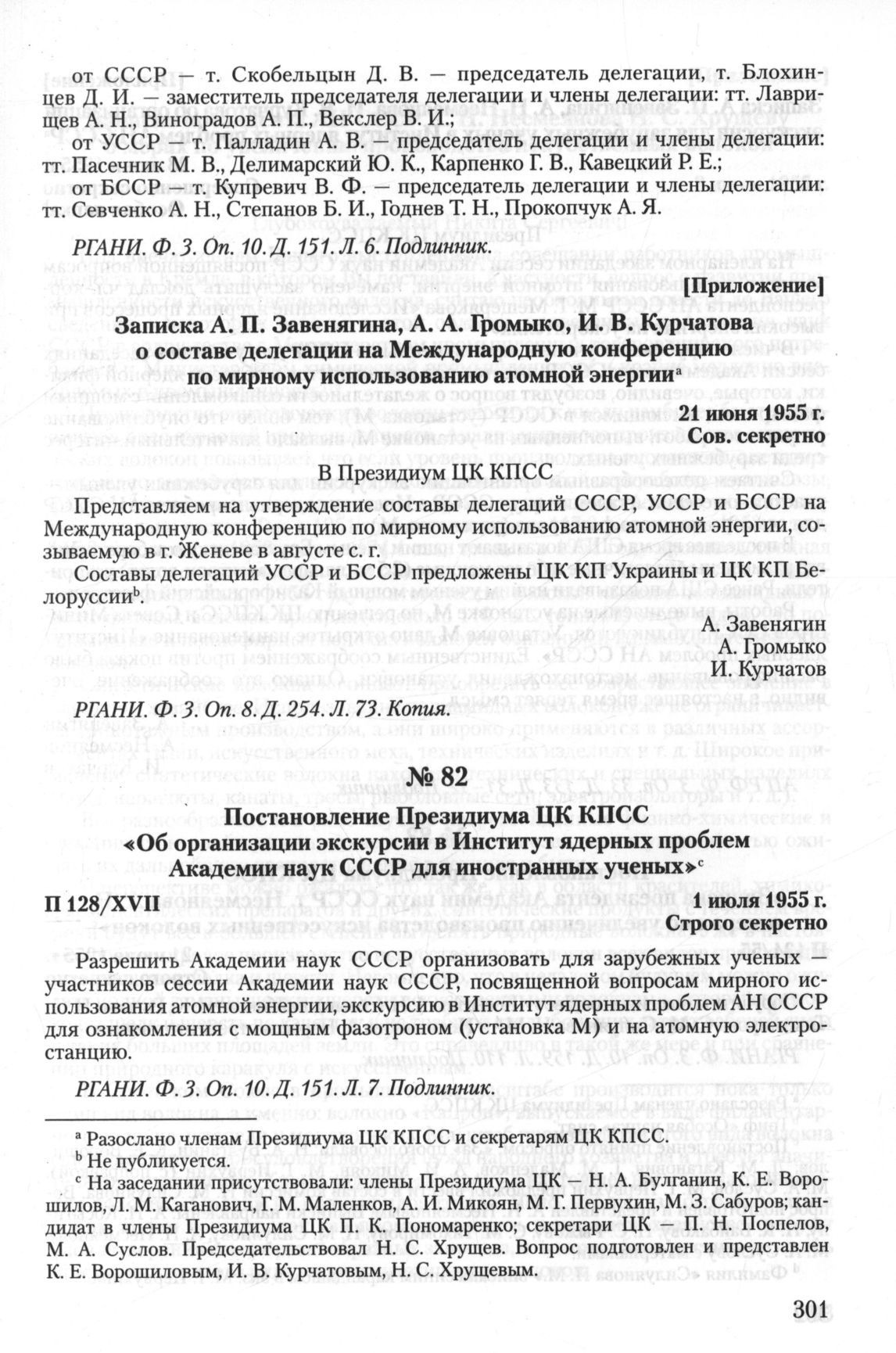 Постановление Президиума ЦК КПСС «Об организации экскурсии в Институт ядерных проблем Академии наук СССР для иностранных ученых». 1 июля 1955 г.