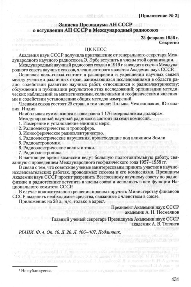Записка Президиума АН СССР о вступлении АН СССР в Международный радиосоюз. 25 февраля 1956 г. // РГАНИ. Ф. 4. Oп. 16. Д. 26. Л. 106-107. Подлинник.