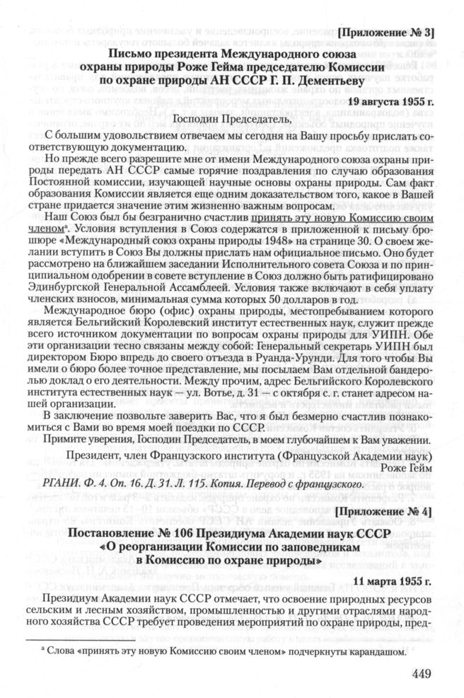 Постановление № 106 Президиума Академии наук СССР «О реорганизации Комиссии по заповедникам в Комиссию по охране природы». 11 марта 1955 г. // РГАНИ. Ф. 4. Oп. 16. Д. 31. Л. 135-136. Заверенная копня.