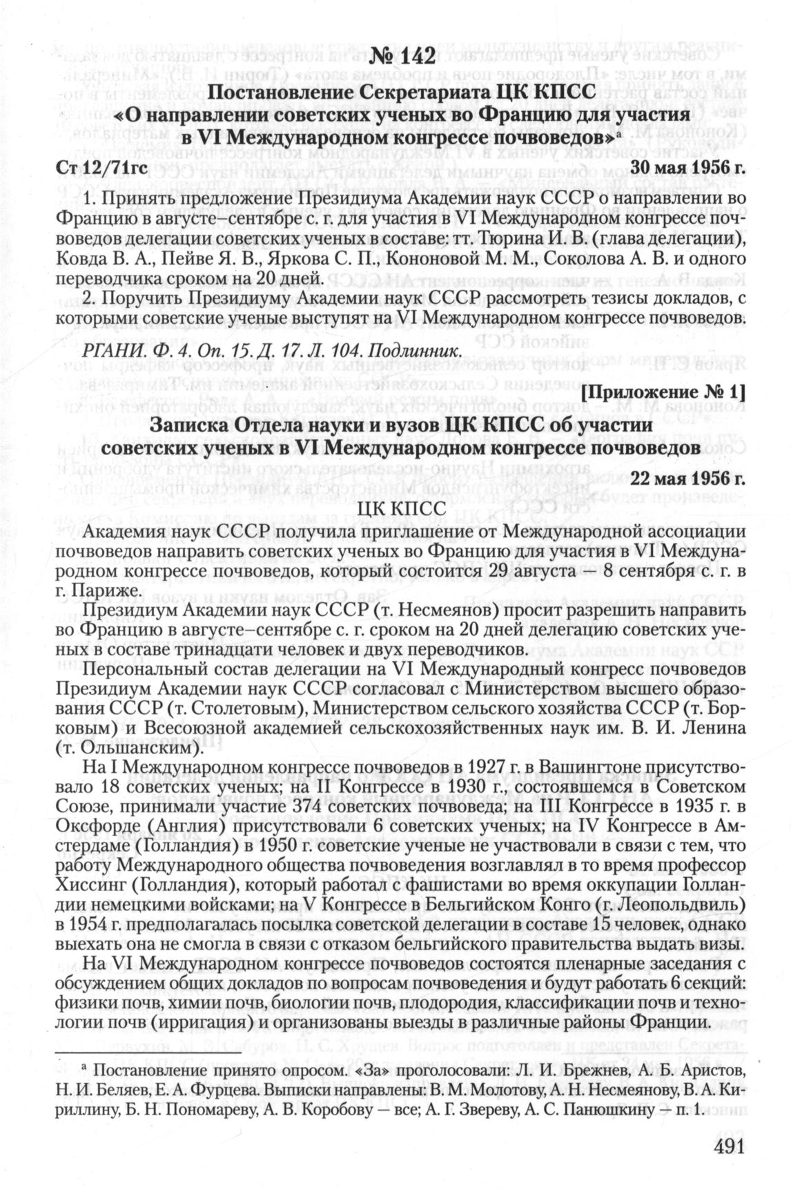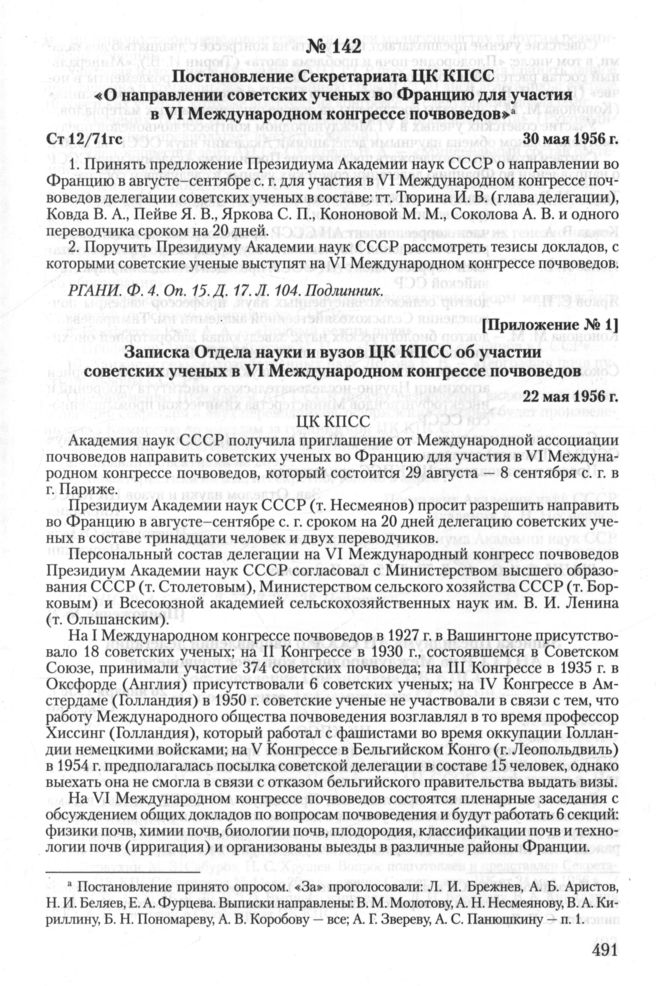 Записка Отдела науки и вузов ЦК КПСС об участии советских ученых в VI Международном конгрессе почвоведов. 22 мая 1956 г. // РГАНИ. Ф. 4. Oп. 16. Д. 77. Л. 25-26. Подлинник.