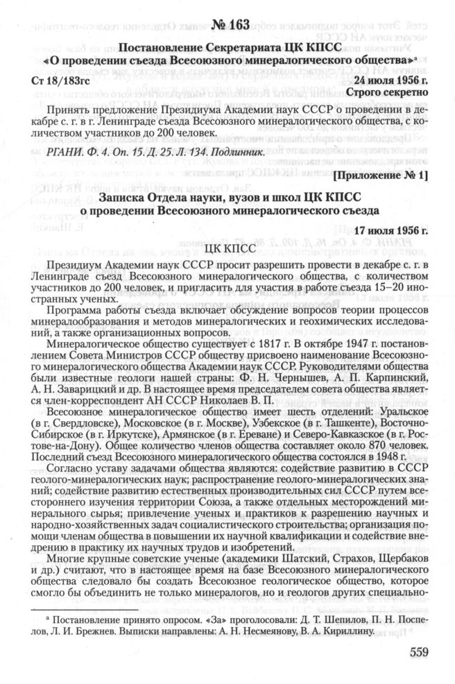 Постановление Секретариата ЦК КПСС «О проведении съезда Всесоюзного минералогического общества». 24 июля 1956 г.