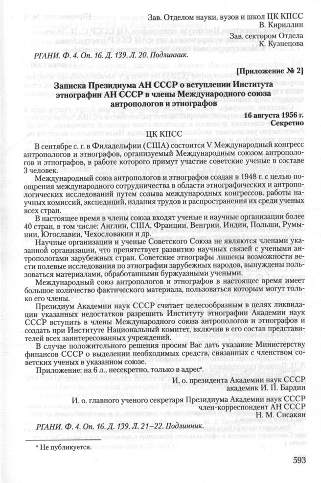 Записка Президиума АН СССР о вступлении Института этнографии АН СССР в члены Международного союза антропологов и этнографов. 16 августа 1956 г. // РГАНИ. Ф. 4. Oп. 16. Д. 139. Л. 21-22. Подлинник.