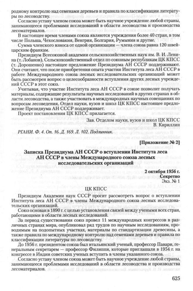 Записка Президиума АН СССР о вступлении Института леса АН СССР в члены Международного союза лесных и сследовательских организаций. 2 октября 1956 г. // РГАНИ. Ф. 4. Oп. 16. Д. 169. Л. 103-105. Подлинник.