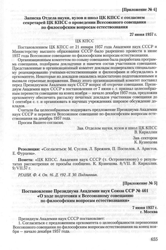 Постановление Президиума Академии наук Союза ССР № 461 «О ходе подготовки к Всесоюзному совещанию по философским вопросам естествознания». 7 июня 1957 г.