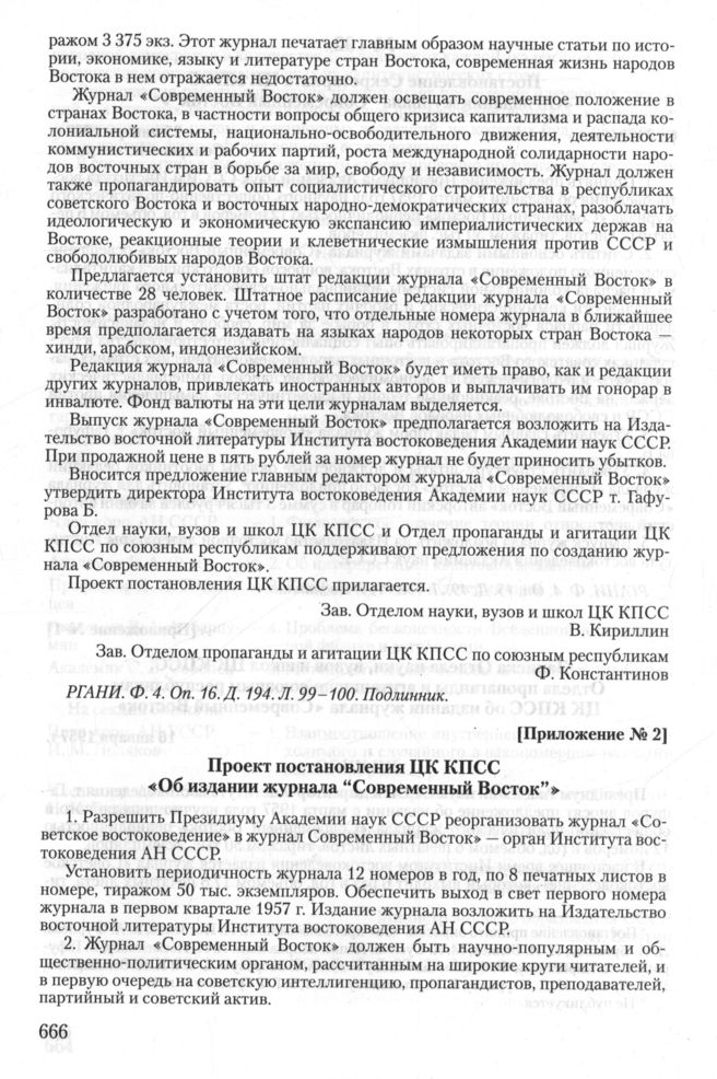 Проект постановления ЦК КПСС «Об издании журнала “Современный Восток”» // РГАНИ. Ф. 4. Oп. 16. Д. 194. Л. 106-108. Заверенная копия.