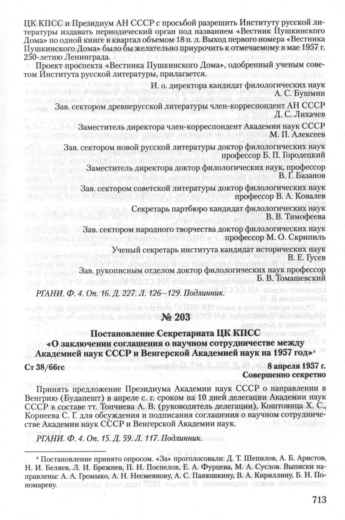 Постановление Секретариата ЦК КПСС «О заключении соглашения о научном сотрудничестве между Академией наук СССР и Венгерской Академией наук на 1957 год». 8 апреля 1957 г.