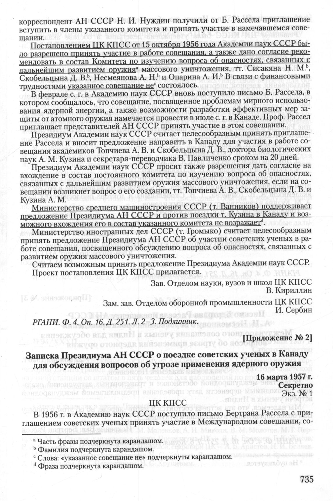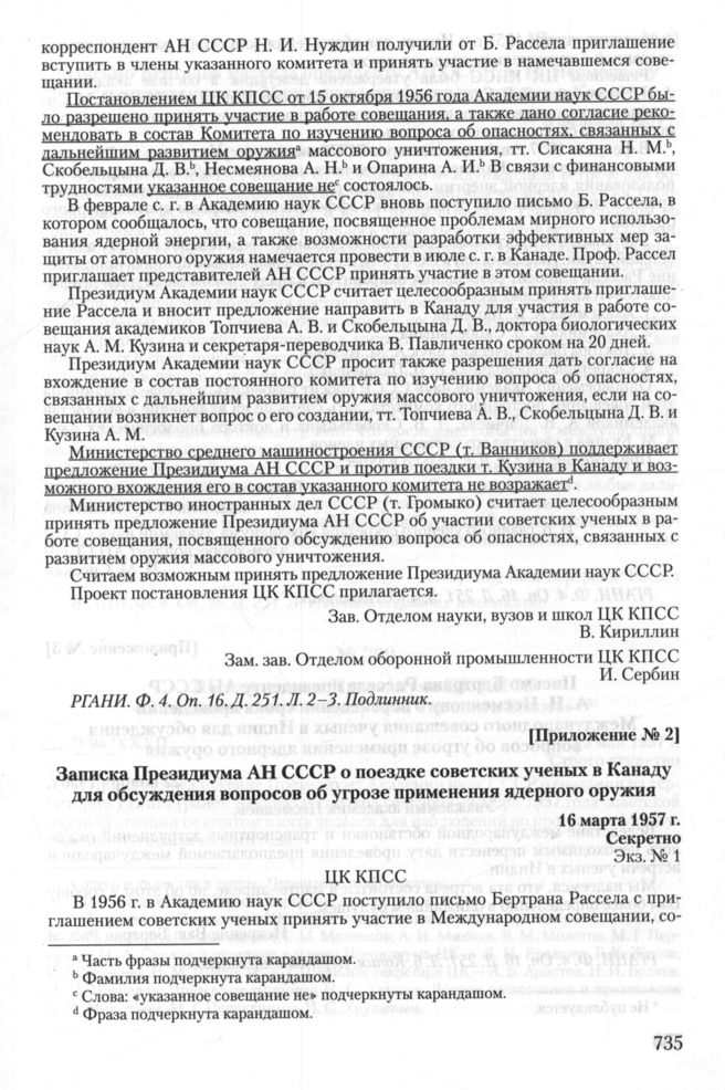 Записка Президиума АН СССР о поездке советских ученых в Канаду для обсуждения вопросов об угрозе применения ядерного оружия. 16 марта 1957 г. // РГАНИ. Ф. 4. Oп. 16. Д. 251. Л. 4-5. Подлинник.