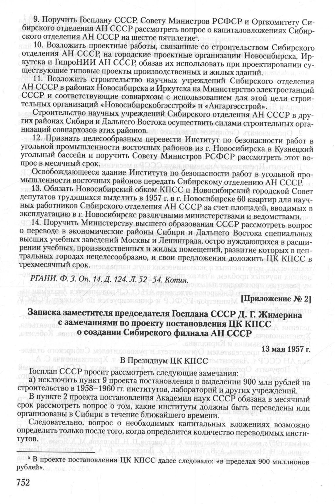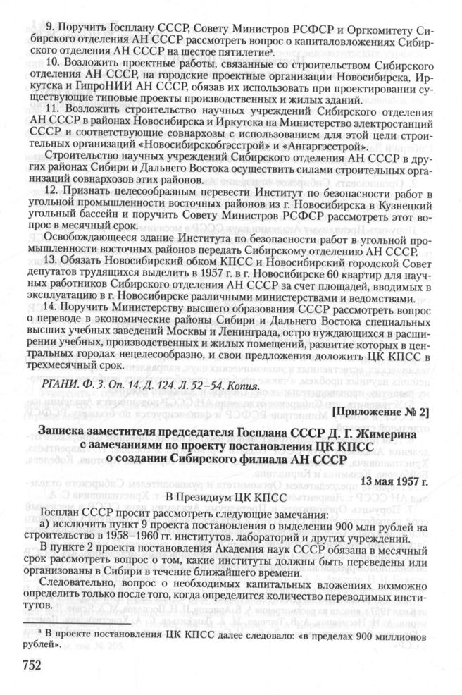 Записка заместителя председателя Госплана СССР Д. Г. Жимерина с замечаниями по проекту постановления ЦК КПСС о создании Сибирского филиала АН СССР. 13 мая 1957 г.