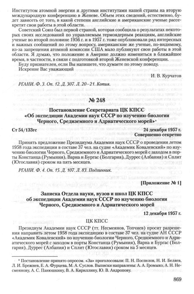 Постановление Секретариата ЦК КПСС «Об экспедиции Академии наук СССР по изучению биологии Черного, Средиземного и Адриатического морей». 24 декабря 1957 г.