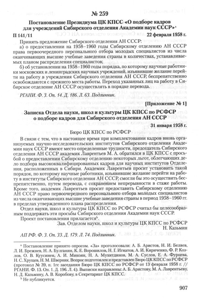 Постановление Президиума ЦК КПСС «О подборе кадров для учреждений Сибирского отделения Академии наук СССР». 22 февраля 1958 г.