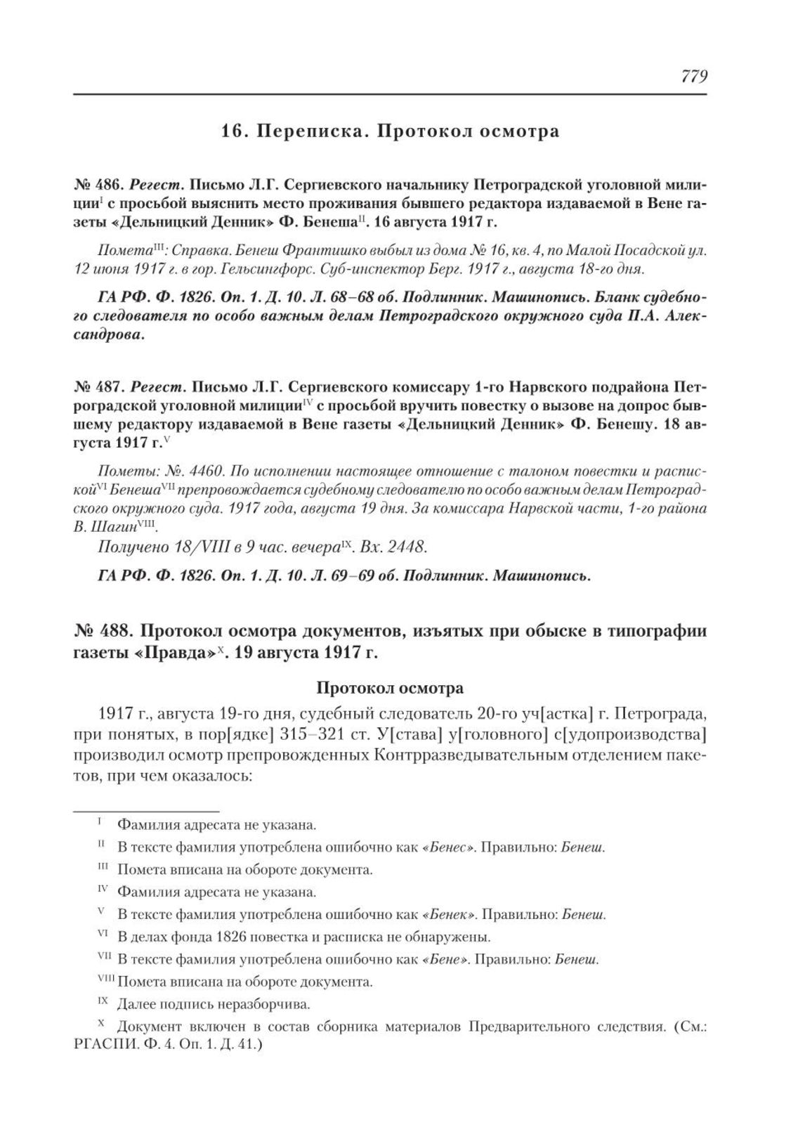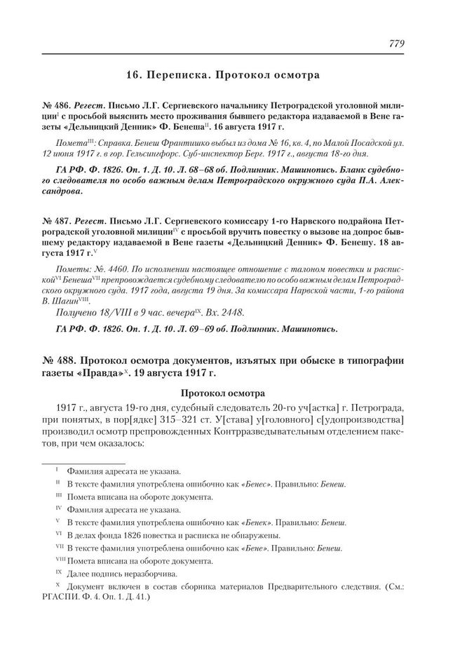Регест. Письмо Л.Г. Сергиевского комиссару 1-го Нарвского подрайона Петроградской уголовной милиции с просьбой вручить повестку о вызове на допрос бывшему редактору издаваемой в Вене газеты «Дельницкий Денник» Ф. Бенешу. 18 августа 1917 г. // ГА РФ. Ф. 1826. Оп. 1. Д. 10. Л. 69–69 об. Подлинник. Машинопись.