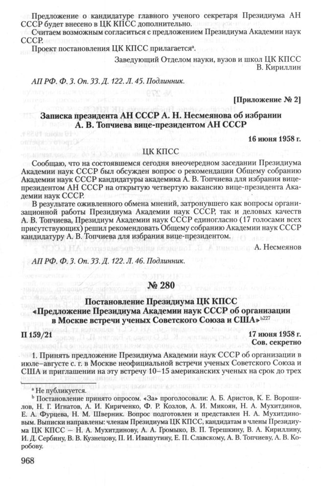 Постановление Президиума ЦК КПСС «Предложение Президиума Академии наук СССР об организации в Москве встречи ученых Советского Союза и США». 17 июня 1958 г.