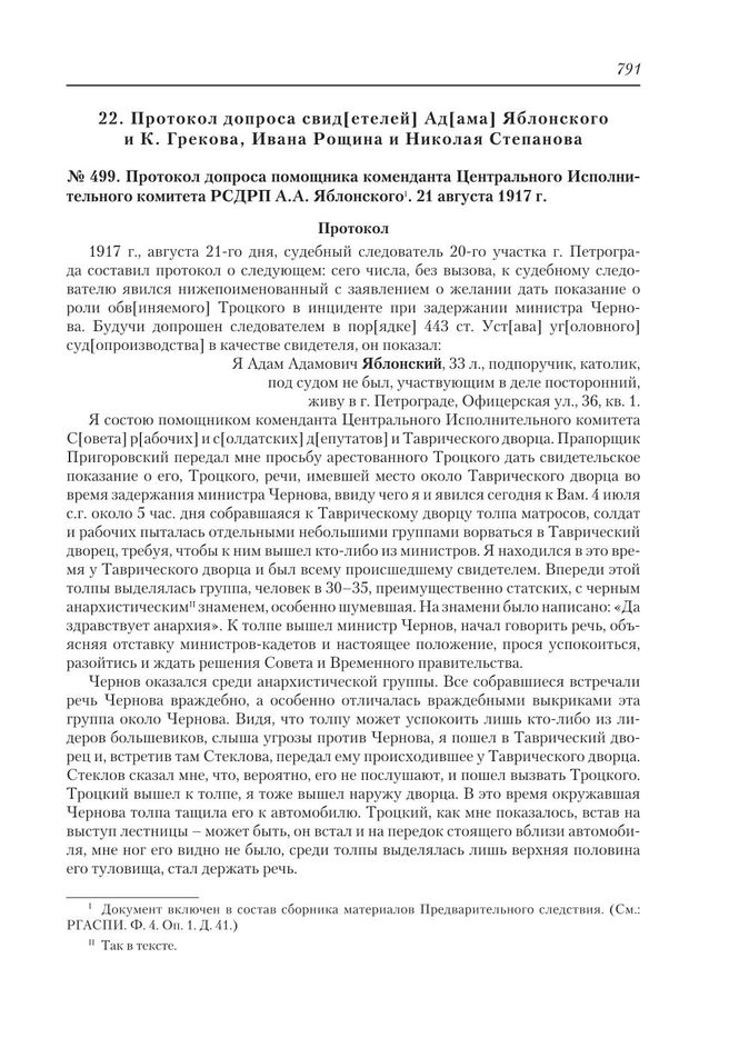 Протокол допроса помощника коменданта Центрального Исполнительного комитета РСДРП А.А. Яблонского. 21 августа 1917 г. : Протокол // ГА РФ. Ф. 1826. Оп. 1. Д. 10. Л. 82–82 об. Подлинник. Машинопись.