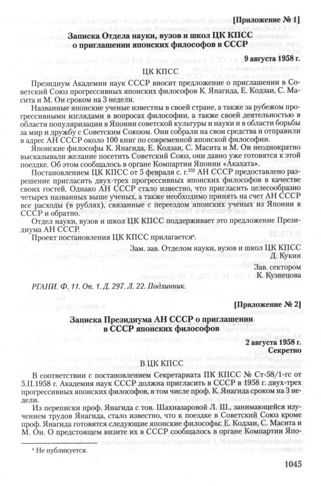 Записка Президиума АН СССР о приглашении в СССР японских философов. 2 августа 1958 г. // РГАНИ. Ф. 11. Oп. 1. Д. 297. Л. 23. Подлинник.