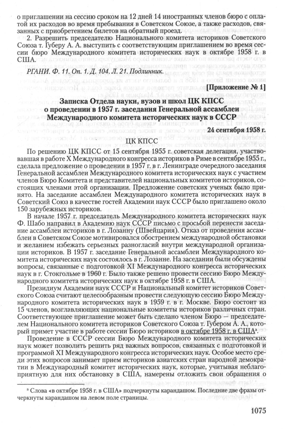 Записка Отдела науки, вузов и школ ЦК КПСС о проведении в 1957 г. заседания Генеральной ассамблеи Международного комитета исторических наук в СССР. 24 сентября 1958 г.