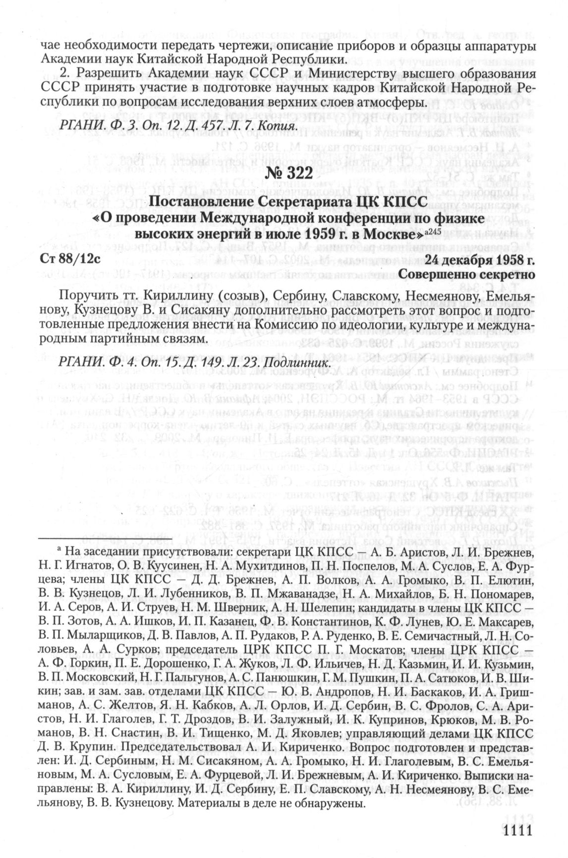 Постановление Секретариата ЦК КПСС «О проведении Международной конференции по физике высоких энергий в июле 1959 г. в Москве». 24 декабря 1958 г.
