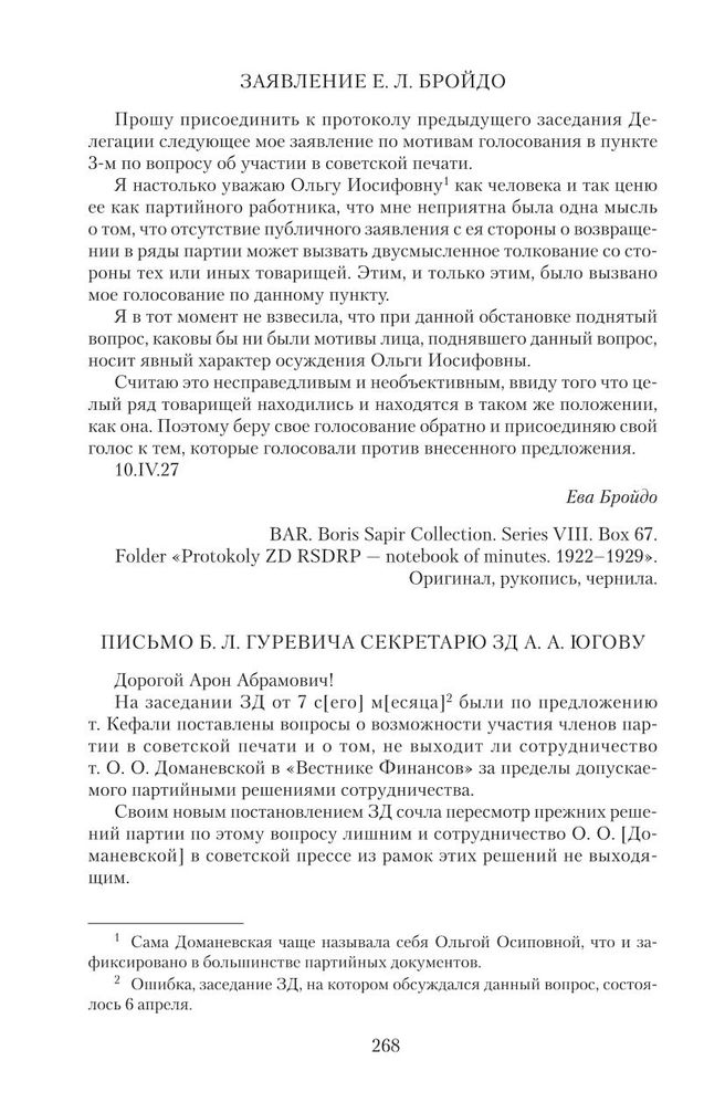 Протокол Заграничной Делегации РСДРП. 1927 г. К протоколу от 2 мая. Письмо Б. Л. Гуревича секретарю ЗД А. А. Югову // BAR. Boris Sapir Collection. Series VIII. Box 67. Folder «Protokoly ZD RSDRP — notebook of minutes. 1922–1929». Машинописный оригинал с автографом.