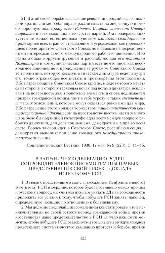 Протокол Заграничной Делегации РСДРП. 1930 г. К протоколу от 30 апреля. В Заграничную Делегацию РСДРП. Сопроводительное письмо группы правых, представивших свой проект доклада Исполкому РСИ. Berlin,15.IV.30 // Hoover Institution Archives, Boris I. Nikolaevsky collection. Series 279. Box 684. Folder 3. Машинописный оригинал, автографы; Социалистический Вестник. 1930. 30 авг. № 16 (230). С. 14–16.