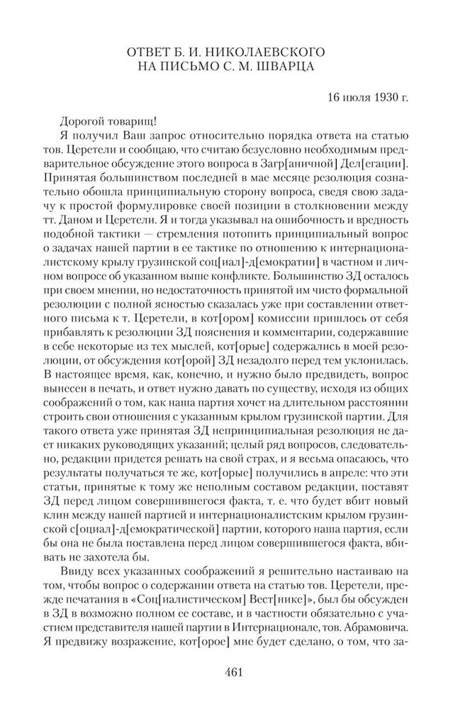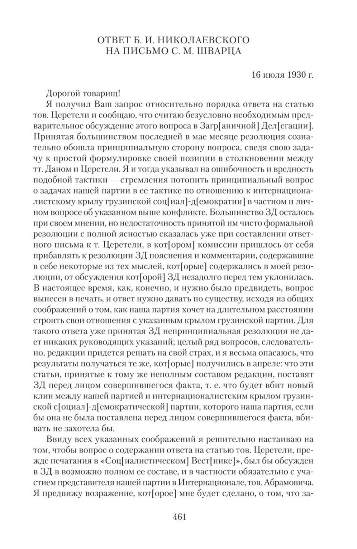 Протокол Заграничной Делегации РСДРП. 1930 г. К решению ЗД от 6 июля. Ответ Б. И. Николаевского на письмо С. М. Шварца 16 июля 1930 г. // BAR. Boris Sapir Collection. Series VIII. Box 67. «Protokoly ZD RSDRP — notebook of minutes. 1930–1931». Оригинал, машинопись с автографом.