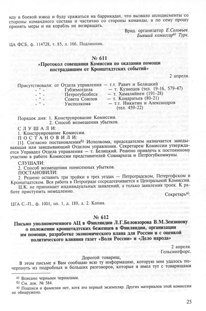 Письмо уполномоченного АЦ в Финляндии Л.Г. Беловзорова В.М. Зензинову о положении кронштадтских беженцев в Финляндии, организации им помощи, разработке экономического плана для России и с оценкой политического влияния газет «Воля России» и «Дело народа». 2 апреля // ГАРФ, ф. 5959, оп. 2, д. 141, л. 14 - 17. Подлинник.