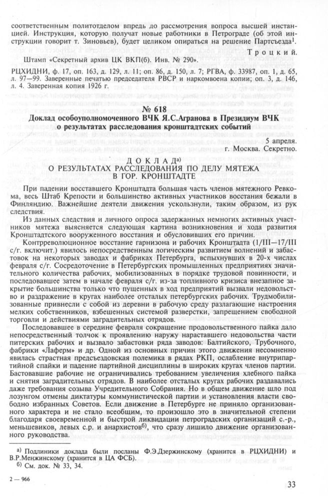 Доклад особоуполномоченного ВЧК Я.С. Агранова в Президиум ВЧК о результатах расследования кронштадтских событий. 5 апреля // ЦА ФСБ, ф. 114728, т. 1А, л. 10 - 22. Автограф; л. 1 - 5. Подлинник; л. 6 - 9. Копия; РЦХИДНИ, ф. 17, оп. 84, д. 229, л. 1 - 17. Подлинник; РГВА, ф. 33987, оп. 3, д. 62, л. 485 - 493. Заверенная копия.