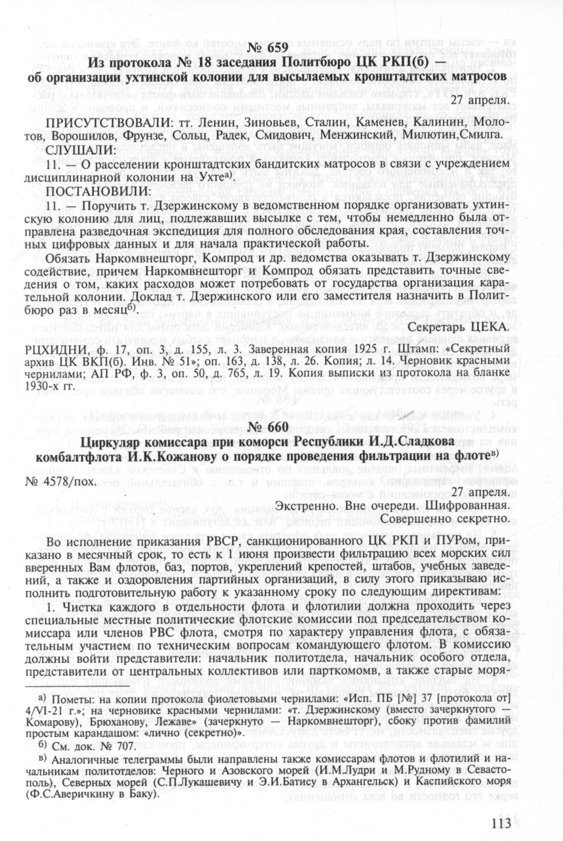 Из протокола № 18 заседания Политбюро ЦК РКП(б) — об организации ухтинской колонии для высылаемых кронштадтских матросов. 27 апреля // РЦХИДНИ, ф. 17, оп. 3, д. 155, л. 3. Заверенная копия 1925 г. Штамп: «Секретный архив ЦК ВКП(б). Инв. № 51»; оп. 163, д. 138, л. 26. Копия; л. 14. Черновик красными чернилами; АП РФ, ф. 3, оп. 50, д. 765, л. 19. Копия выписки из протокола на бланке 1930-х гг.