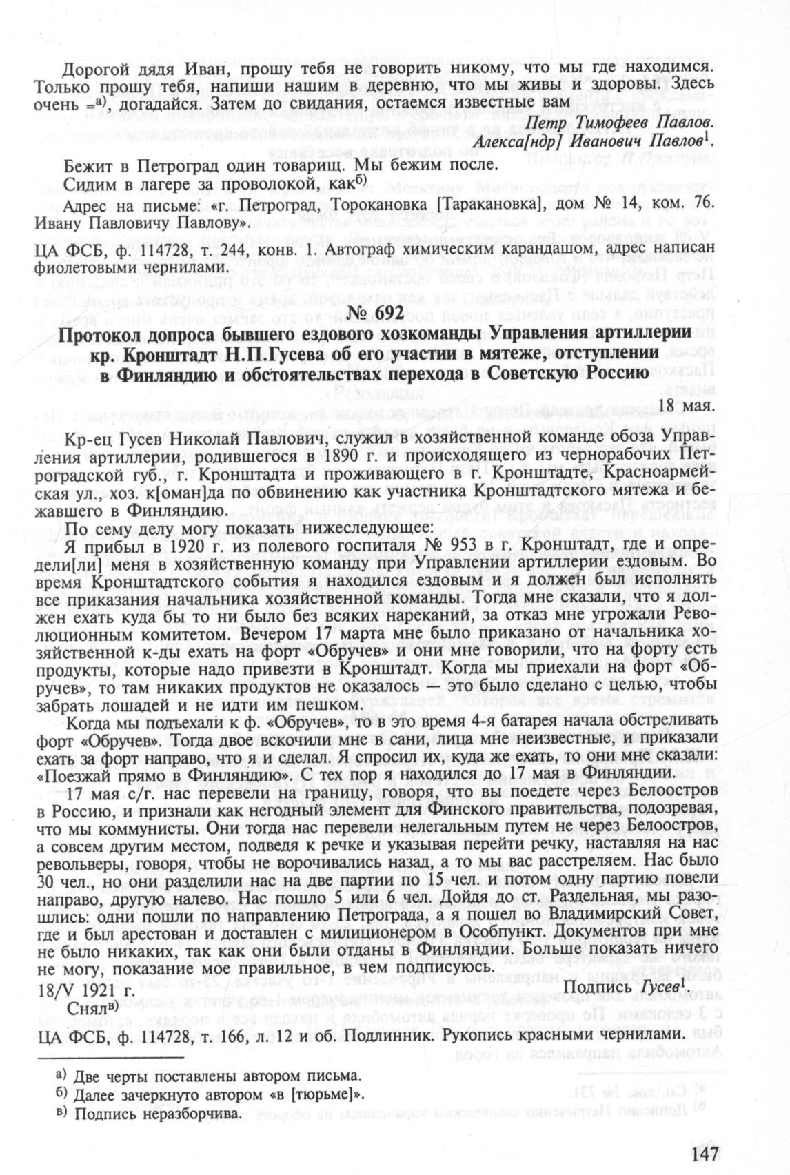 Протокол допроса бывшего ездового хозкоманды Управления артиллерии кр. Кронштадт Н.П. Гусева об его участии в мятеже, отступлении в Финляндию и обстоятельствах перехода в Советскую Россию. 18 мая // ЦА ФСБ, ф. 114728, т. 166, л. 12 и об. Подлинник. Рукопись красными чернилами.