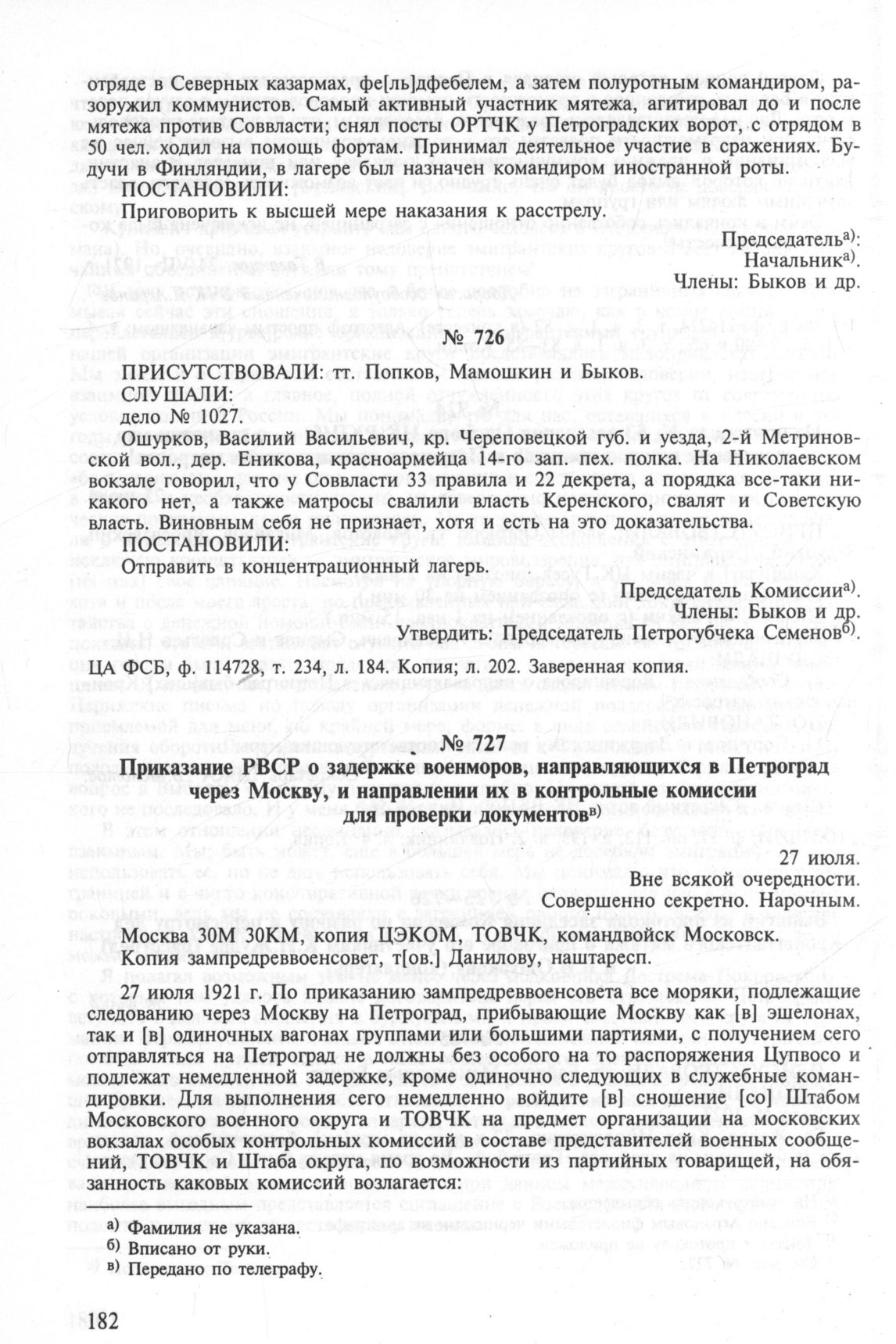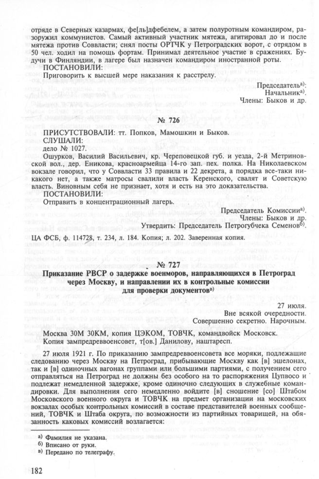 Приказание РВСР о задержке военморов, направляющихся в Петроград через Москву, и направлении их в контрольные комиссии для проверки документов. 27 июля
