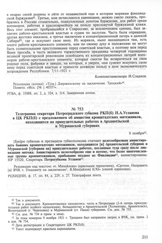 Телеграмма секретаря Петроградского губкома РКП(б) Н.А. Угланова в ЦК РКП(б) с предложением об амнистии кронштадтских мятежников, находящихся на принудительных работах в Архангельской и Мурманской губерниях. 8 ноября
