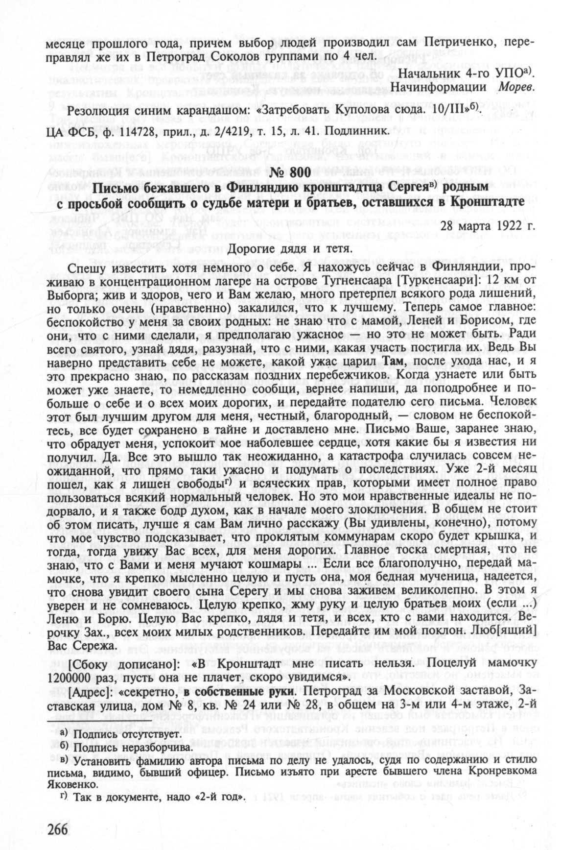 Письмо бежавшего в Финляндию кронштадтца Сергея родным с просьбой сообщить о судьбе матери и братьев, оставшихся в Кроншатдте. 28 марта 1922 г. // ЦА ФСБ, ф. 114728, прил., д. 2/4219, т. 7, л. 116-119. Автограф черными чернилами.
