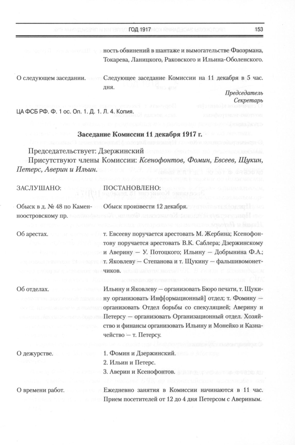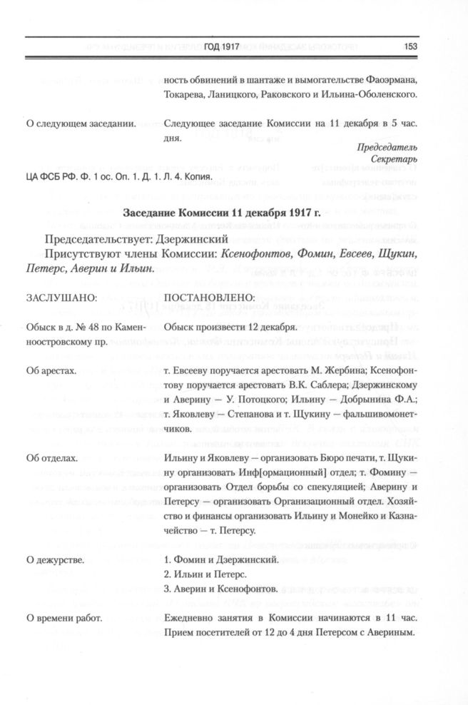 Протоколы заседаний комиссии, коллегии и президиума ВЧК. Заседание Комиссии 11 декабря 1917 г. // ЦА ФСБ РФ. Ф. 1ос. Оп. 1. Д. 1. Л. 5. Копия.