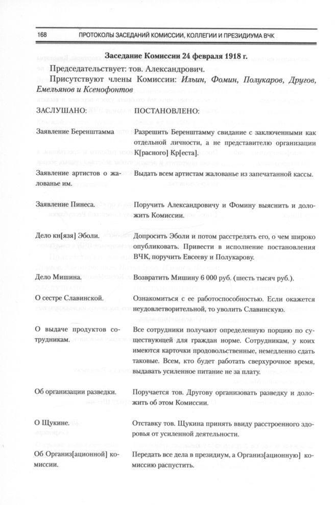 Протоколы заседаний комиссии, коллегии и президиума ВЧК. Заседание Комиссии 24 февраля 1918 г.