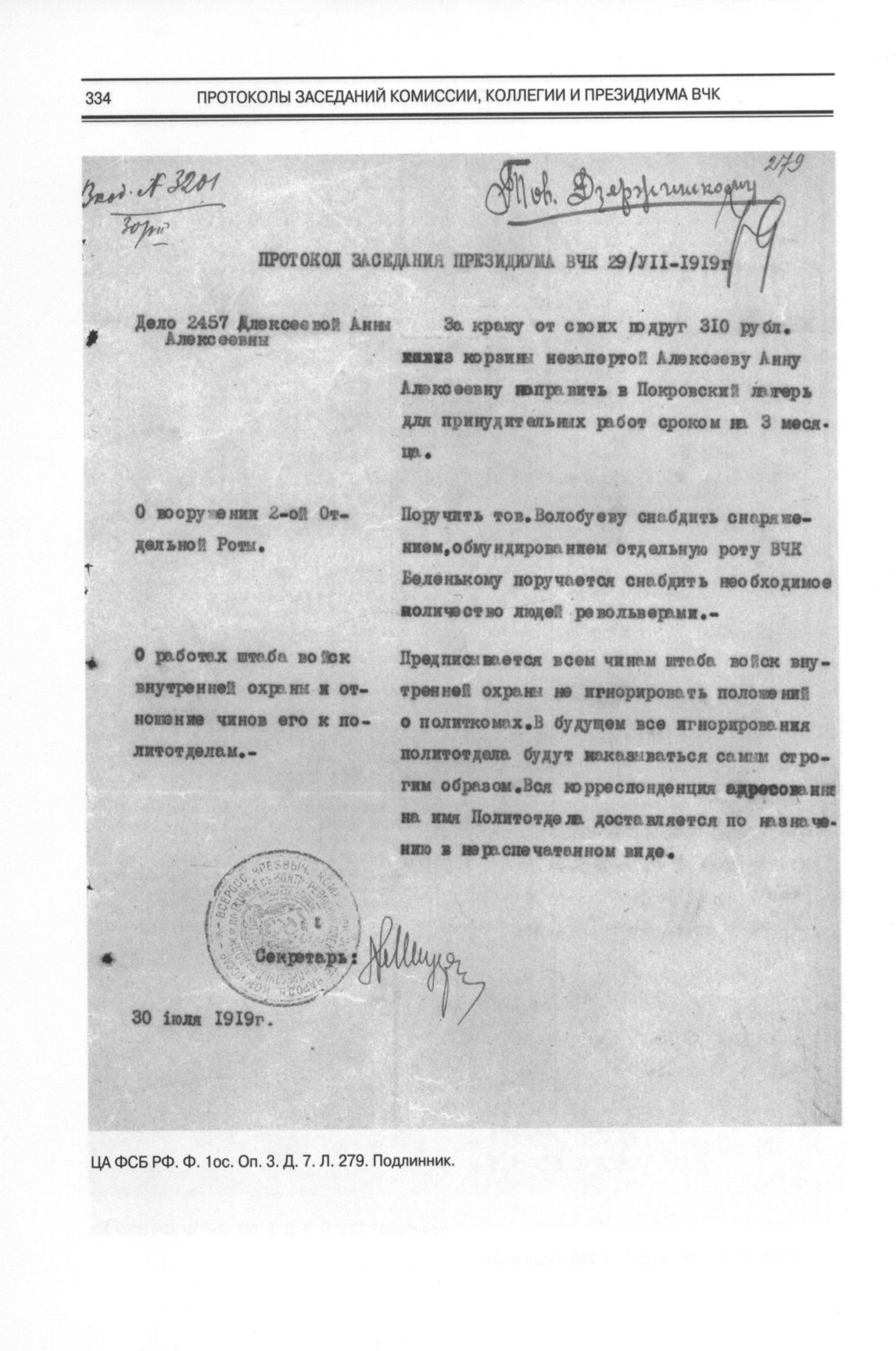 Протоколы заседаний комиссии, коллегии и президиума ВЧК. Протокол заседания Президиума ВЧК 29/VII-1919 г. // ЦА ФСБ РФ. Ф. 1ос. Оп. 3. Д. 7. Л. 279. Подлинник.