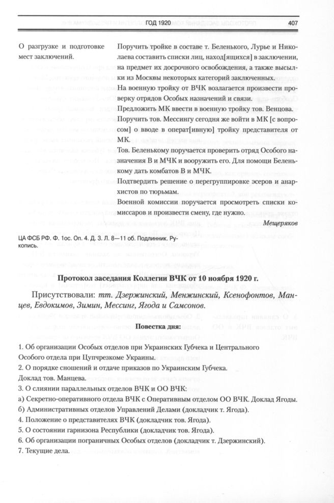 Протоколы заседаний комиссии, коллегии и президиума ВЧК. Протокол заседания Коллегии ВЧК от 10 ноября 1920 г. // ЦА ФСБ РФ. Ф. 1ос. Оп. 4. Д. 3. Л. 12-13. Подлинник. Рукопись.