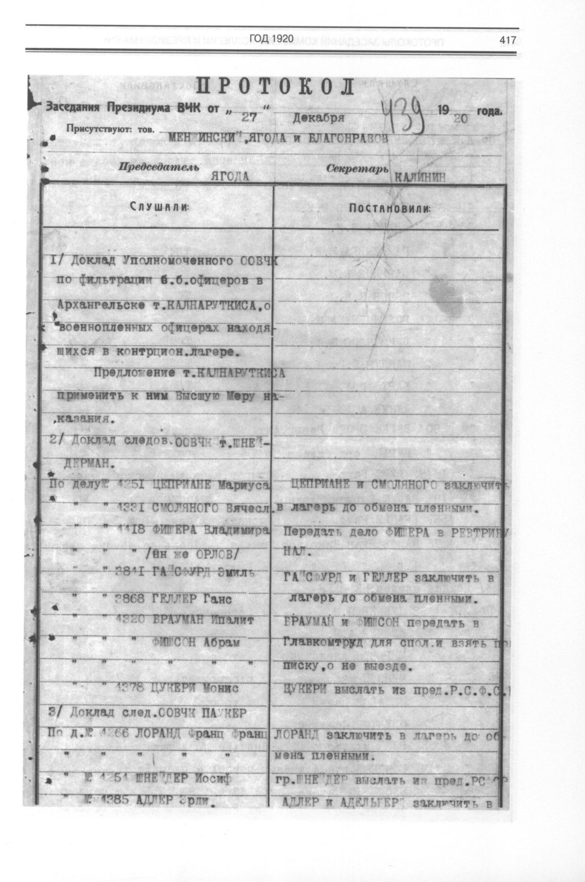 Протоколы заседаний комиссии, коллегии и президиума ВЧК. Протокол заседания Президиума ВЧК от 27 декабря 1920 года // ЦА ФСБ РФ. Ф. 1ос. Оп. 4. Д. 1. Л. 439-440 об. Заверенная копия.