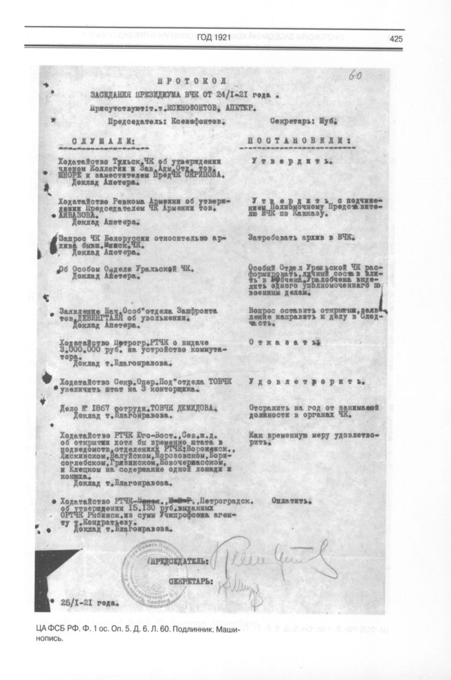 Протоколы заседаний комиссии, коллегии и президиума ВЧК. Протокол заседания Президиума ВЧК от 24/ I - 21 года // ЦА ФСБ РФ. Ф. 1ос. Оп. 5. Д. 6. Л. 60. Подлинник. Машинопись.