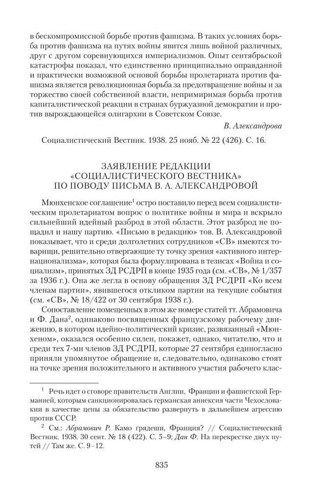 Протокол Заграничной Делегации РСДРП. 1938 г. Заявление редакции «Социалистического Вестника» по поводу письма В. А. Александровой // Социалистический Вестник. 1938. 25 нояб. № 22 (426). С. 16.
