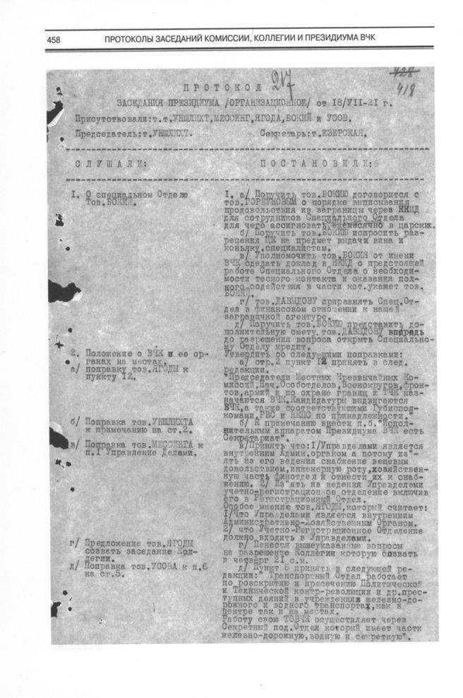 Протоколы заседаний комиссии, коллегии и президиума ВЧК. Протокол заседания Президиума / организационное / от 18/VII-21 г.