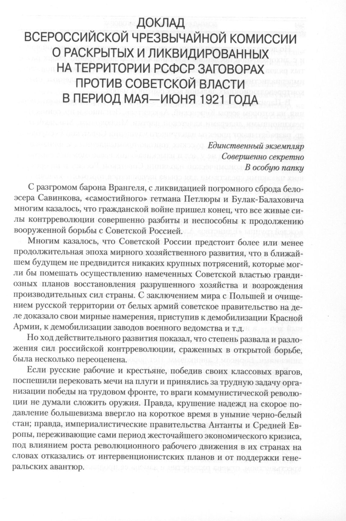 Доклад ВЧК о раскрытых и ликвидированных на территории РСФСР заговорах против Советской власти в период мая-июня 1921 года // ЦА ФСБ РФ. Ф. 1. Оп. 5. Д. 10. Л. 1-20. Машинописная копия.