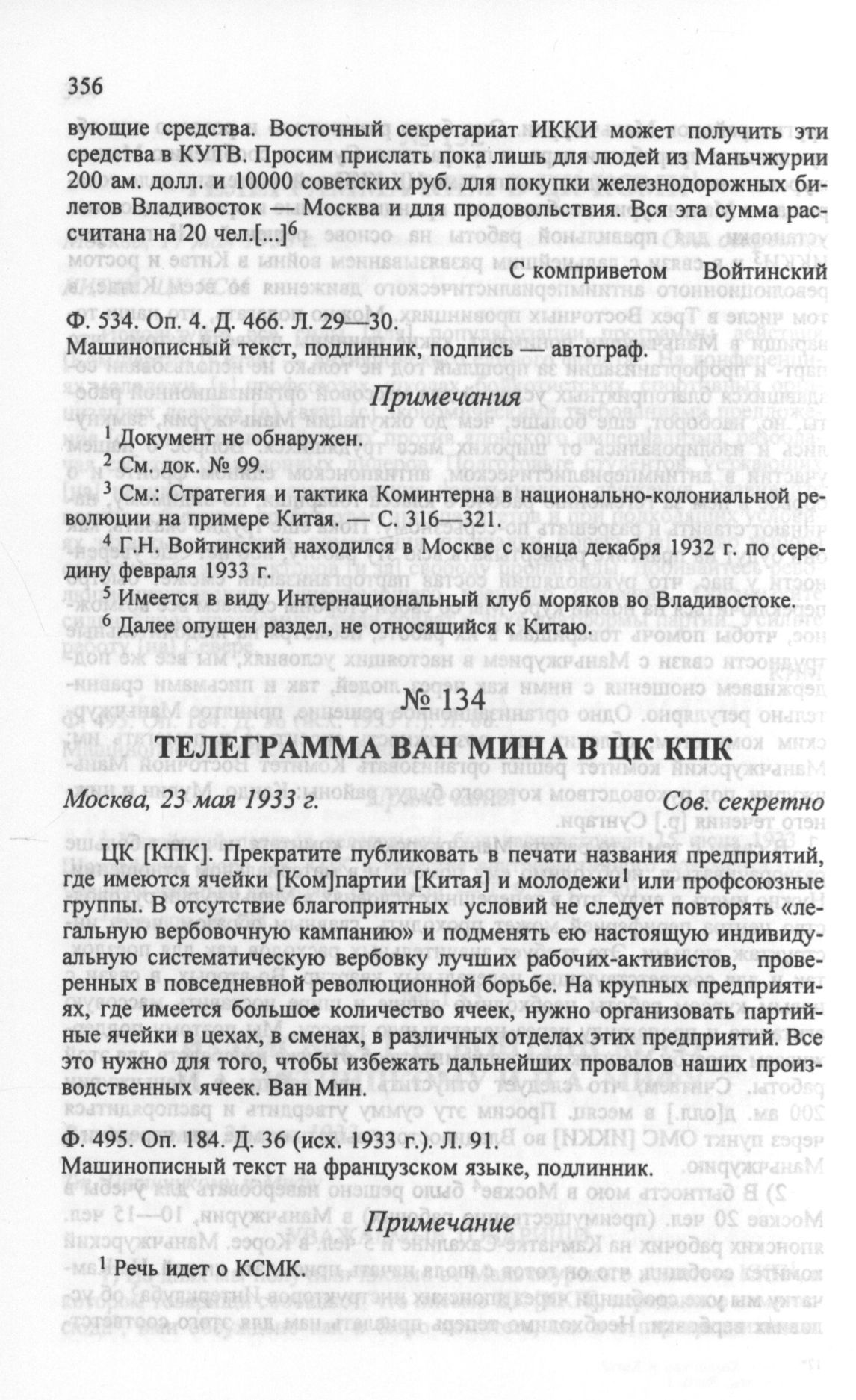 Телеграмма Ван Мина в ЦК КПК. Москва, 23 мая 1933 г. // РГАСПИ. Ф. 495. Оп. 184. Д. 36 (исх. 1933 г.). Л. 91. Машинописный текст на французском языке, подлинник.