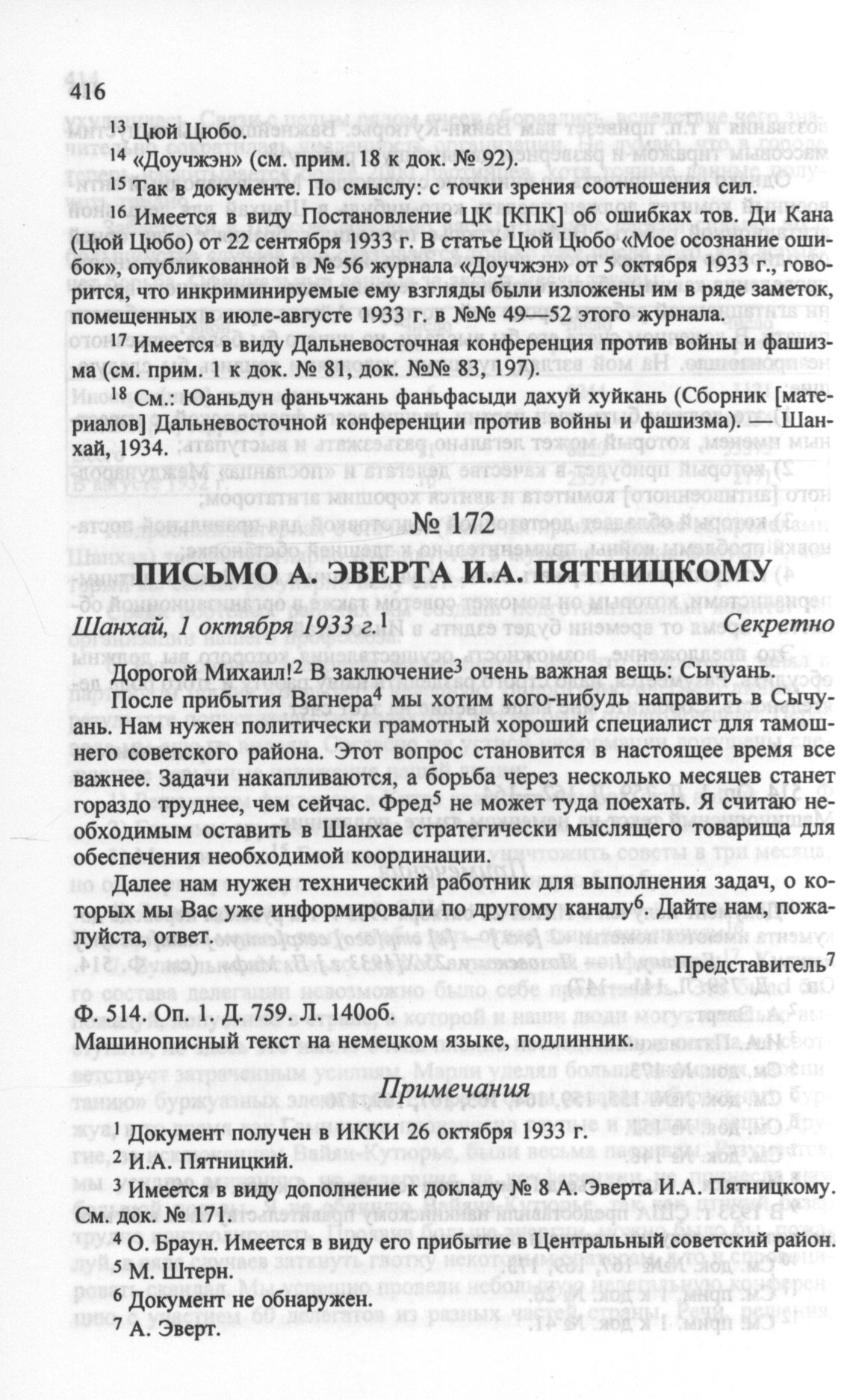 Письмо А. Эверта И.А. Пятницкому. Шанхай, 1 октября 1933 г. // РГАСПИ. Ф. 514. Oп. 1. Д. 759. Л. 140об. Машинописный текст на немецком языке, подлинник.