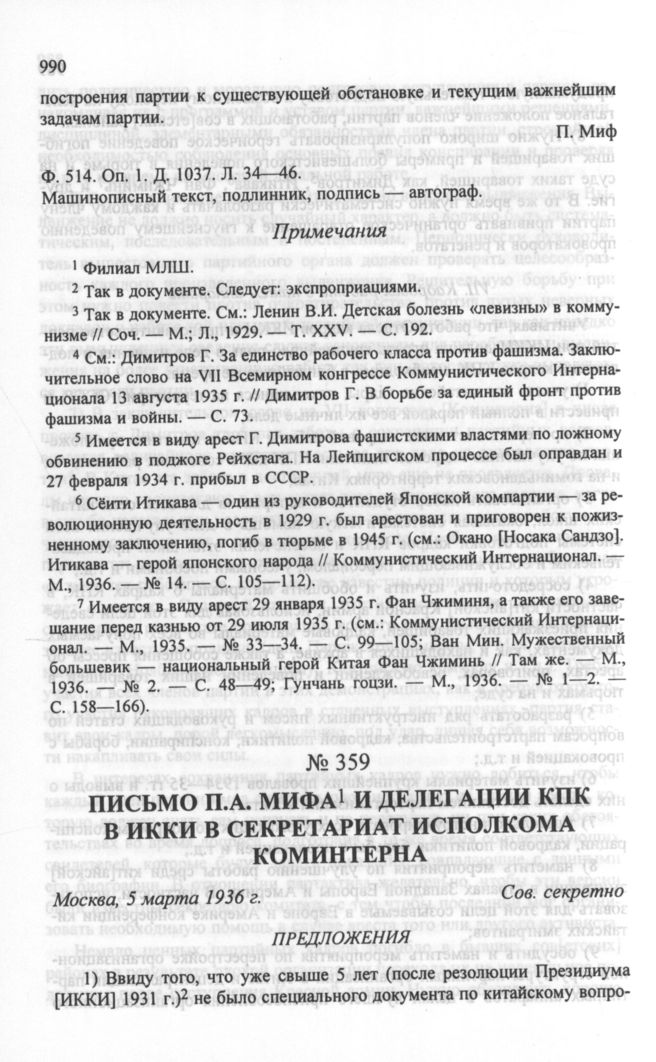 Письмо П.А. Мифа и Делегации КПК в ИККИ в Секретариат Исполкома Коминтерна. Москва, 5 марта 1936 г. // РГАСПИ. Ф. 154. Oп. 1. Д. 847. Л. 27—31. Машинописный текст, подлинник.