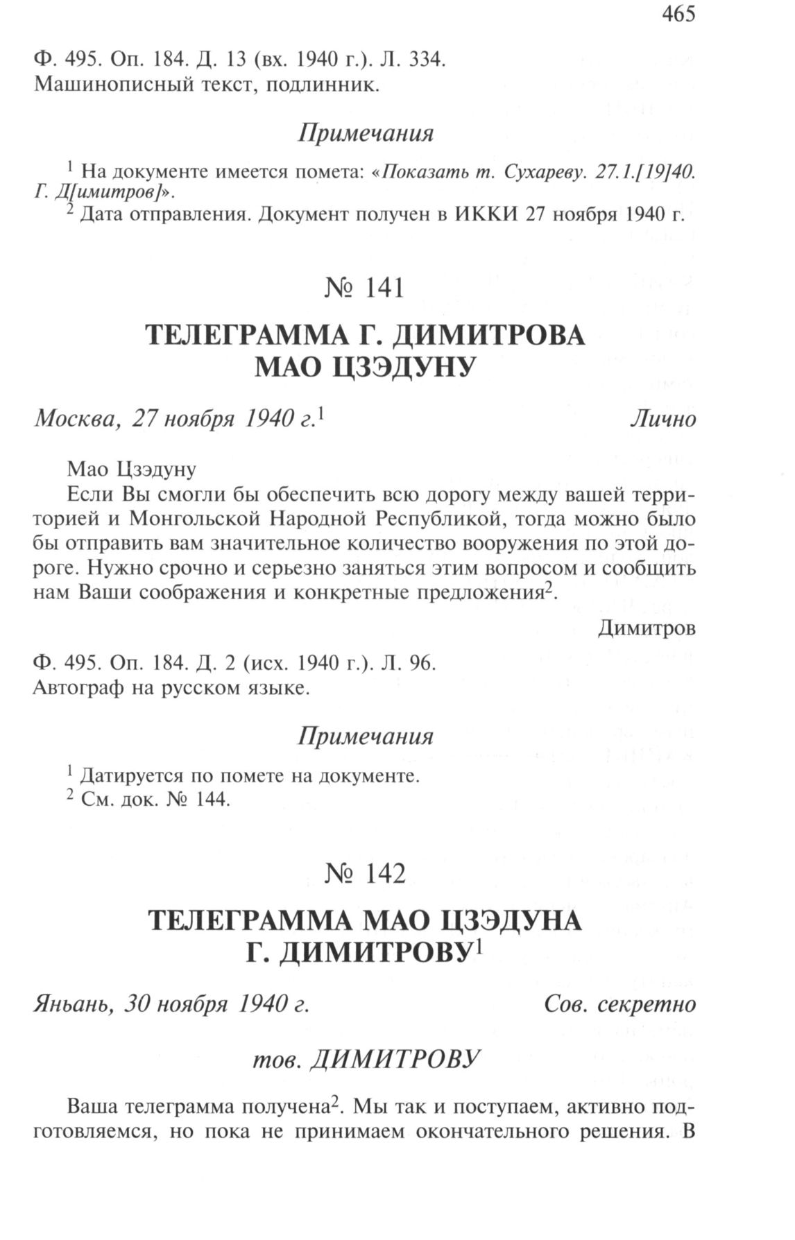 Телеграмма Г. Димитрова Мао Цзэдуну. Москва, 27 ноября 1940 г.