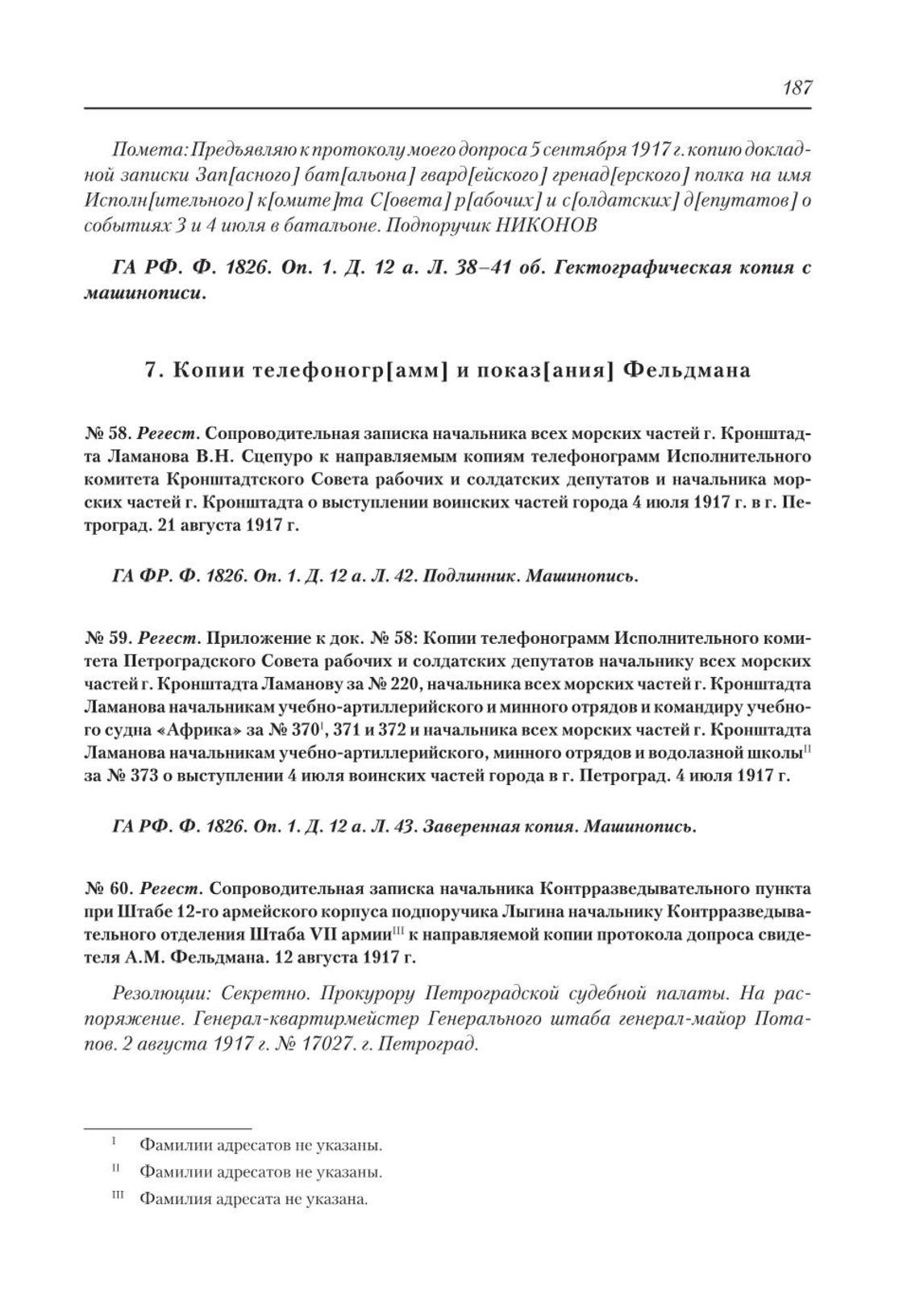 Регест. Приложение к док. № 58: Копии телефонограмм Исполнительного комитета Петроградского Совета рабочих и солдатских депутатов начальнику всех морских частей г. Кронштадта Ламанову за № 220, начальника всех морских частей г. Кронштадта Ламанова начальникам учебно-артиллерийского и минного отрядов и командиру учебного судна «Африка» за № 370, 371 и 372 и начальника всех морских частей г. Кронштадта Ламанова начальникам учебно-артиллерийского, минного отрядов и водолазной школы за № 373 о выступлении 4 июля воинских частей города в г. Петроград. 4 июля 1917 г. // ГА РФ. Ф. 1826. Оп. 1. Д. 12 а. Л. 43. Заверенная копия. Машинопись.